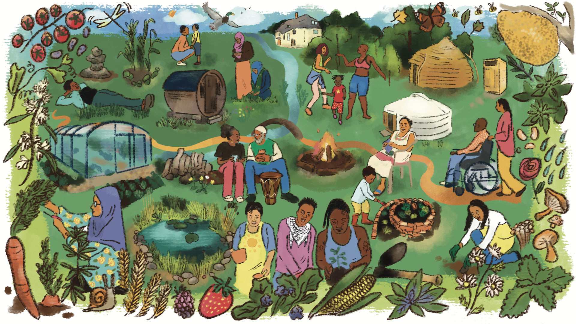 Our land project is shaped with and for our community. Through collective dreaming sessions, we have envisioned what this land could be. This beautiful visualisation, by Migrants In Culture, captures our aspirations: